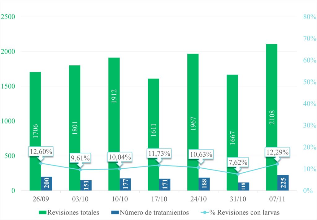Desde el inicio de campaña y a fecha de 6 de noviembre de 2025 se han realizado más de 37.000 revisiones con presencia de larvas en 15,05 % en casi de 4.200 puntos diferentes, y se han llevado a cabo sobre 4.284 tratamientos terrestres larvicidas con en las diferentes localizaciones, sobre una superficie total acumulada de 528 hectáreas. En la semana del 3 al 7 de noviembre se ha constatado la presencia de larvas y pupas de mosquitos en un 12,29 % de las 2.108 revisiones llevadas a cabo en este período, y realizado 225 tratamientos sobre una superficie de 319 mil m2.