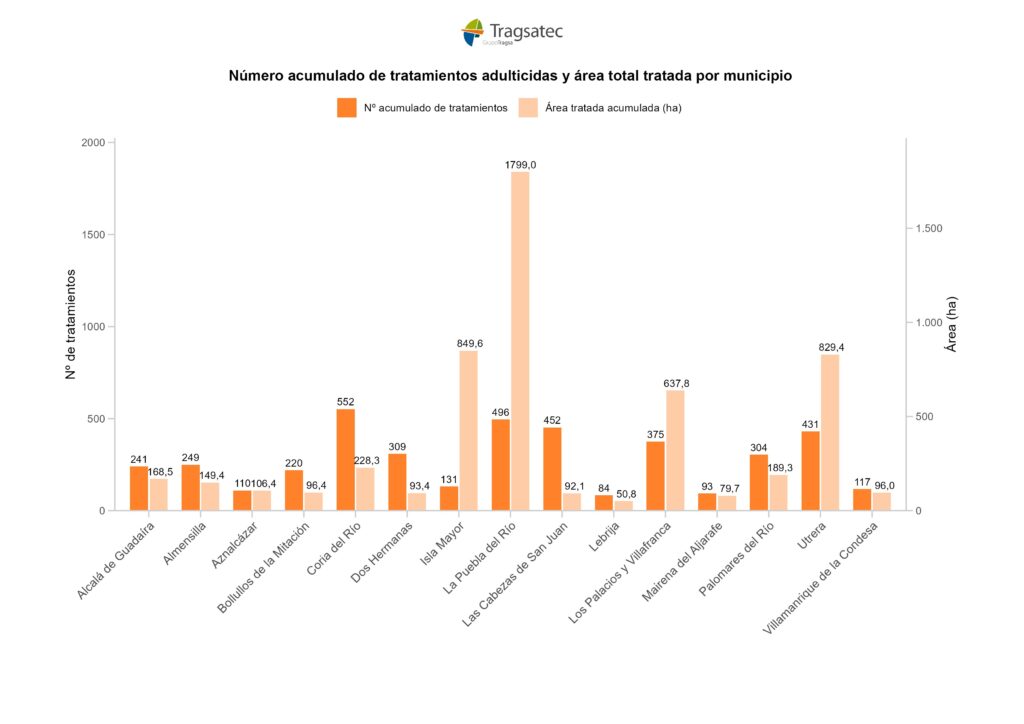 Tal y como se ha indicado, se han realizado tratamientos adulticidas en aquellos municipios donde se ha constatado una elevada densidad de mosquitos adultos. Los datos acumulados desde que comenzó la campaña muestran la realización de 4.504 tratamientos terrestres en 797 puntos sobre una superficie acumulada de más de 5.466 ha. Por último, si se atiende a los números registrados la pasada semana, del 3 al 7 de noviembre, se puede observar cómo se llevaron a cabo un total de 392 tratamientos en 390 puntos sobre un área tratada de 280 ha.