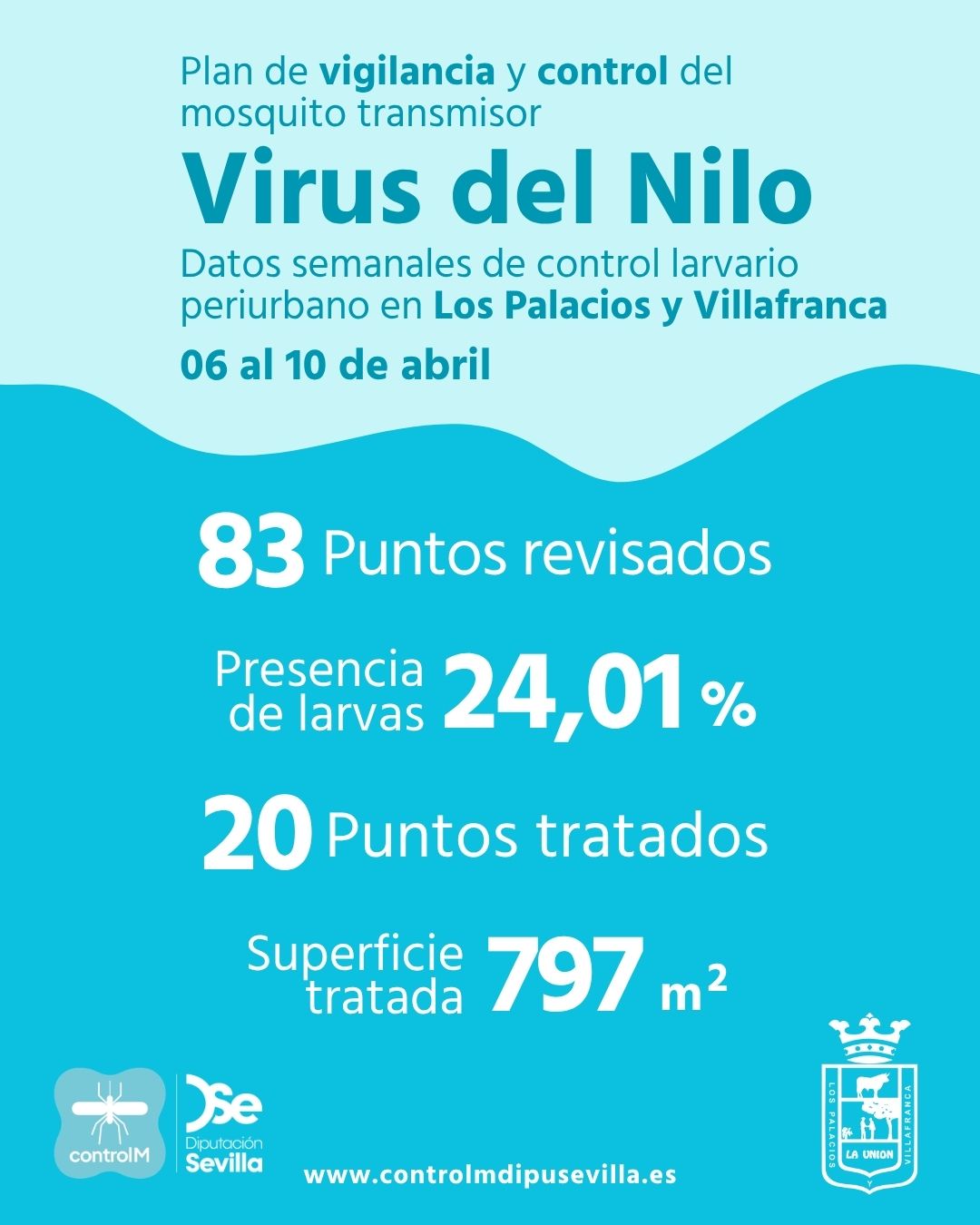 abril 14, 2026 Resultados trabajos de vigilancia y control de larvas en Los Palacios y Villafranca. Semana del 06 al 10 de abril. Actuaciones Diputación 👉 Descargar datos de Los Palacios y Villafranca